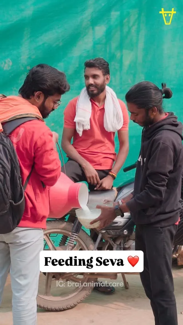 Our daily feedings include milk, fruits and chickpeas to Braj animals such as dogs and monkeys.